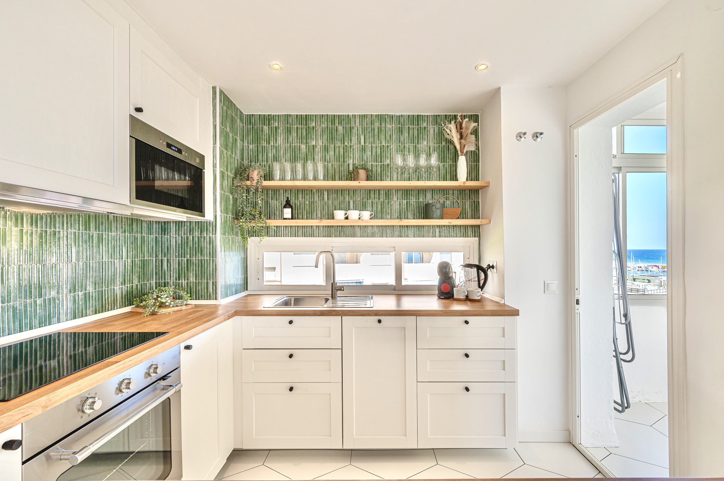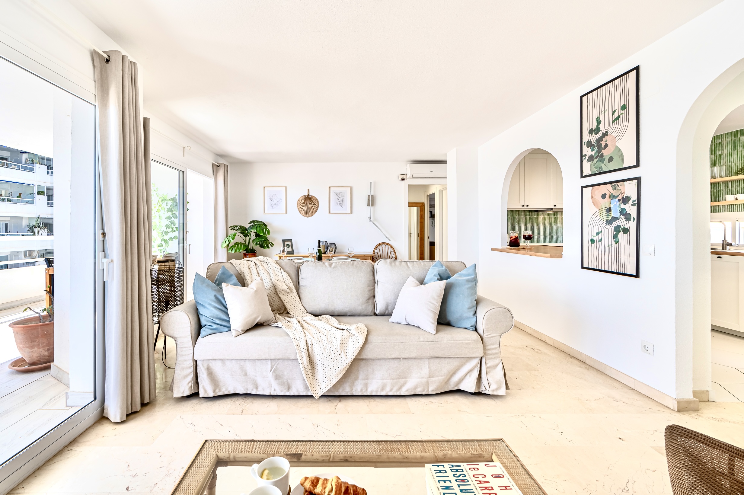 Spectacular balcony on the 4th floor with sun loungers, dining table, comfy lounge style chairs looking out over the Marina - Gibraltar in the distance